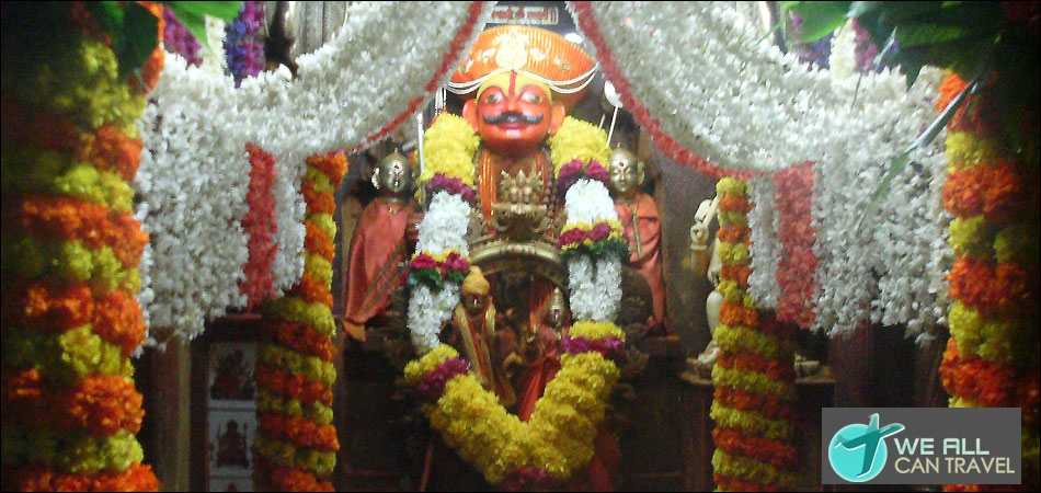 Khandoba, also known as Khanderao, Khanderaya, Malhari Martand and Mallu Khan is a regional Hindu deity, worshipped as M?rtanda Bhairava, a form of Shiva, mainly in the Deccan plateau of India. He is the most popular family deity in Maharashtra, the patron deity of Deshastha brahmin, warrior, farming and herding castes, the hunters and gatherers of the hills and forests. The cult of Khandoba has linkages with Vaishnava and Jain traditions, and also assimilates all communities irrespective of caste, including Muslims. Khandoba is sometimes identified with Mallanna of Andhra Pradesh and Mailara of Karnataka. The worship of Khandoba developed during the 9th and 10th centuries from a folk deity into a composite god possessing the attributes of Shiva, Bhairava, Surya and Karttikeya Skanda. He is depicted either in the form of a Lingam, or as an image riding on a bull or a horse. The foremost centre of Khandoba worship is Jejuri in Maharashtra. The legends of Khandoba, found in the text Malhari Mahatmya and also narrated in folk songs, revolve around his victory over demons Mani-malla and his marriages. There are various stone images of elephants on either sides of the main gateway of the temple. On the right hand side of the gate, is an object resembling a Shiva-ling, around which a niche known as the 'Isavalakacha bhunga' is built. The entire flat plateau above the hill is surrounded by a stone pavement in the center, of which stands the Khandoba shrine. The whole courtyard is surrounded by arched aisles on sides, from which highly ornate balconies with cypress pillars and cusped arches project out.This enclosure has three gateways.The temple faces the east. The outermost portion is an arched portico- consisting of a square mandap and garbhagriha. Over the portico, a big 'Khanda' sword, an attribute of the god is hung. In the garbhagriha, there are two swayambhu lings, that of Khandoba and the other representating Mhalsa, his consort, covered with silver masks. The noticeable features outside the temple are a stone tortoise; a small cell used for performing the rites of Bagad; and a giant image of demon Mani.