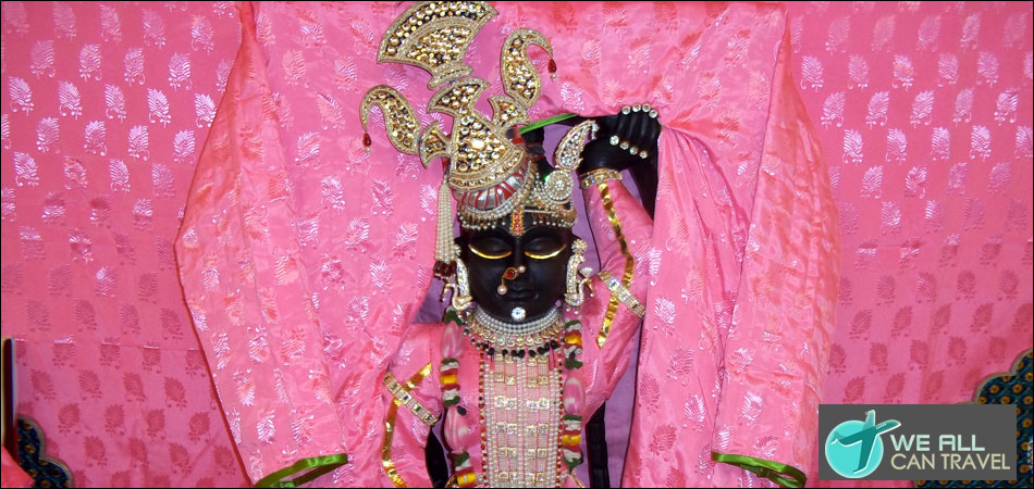 Srinathji temple Located in Shri Nathadwara in Rajasthan (India) is an absolutely beautiful black marble Deity of Lord Krishna, standing with His hand upraised lifting Govardhana Hill. The idol of Srinathji, sculpted out of one piece of black marble was installed first at the Jatipura temple at Mathura (UP) by Jagatguru Sri Vallabhacharya. Shri Nathdwara (a pathway to Lord Shri Krishna) literally means the gateway to the Lord ShriNathji. This great Vaishnavite shrine was built in the 17th century on spot exactly identified by the Lord himself.